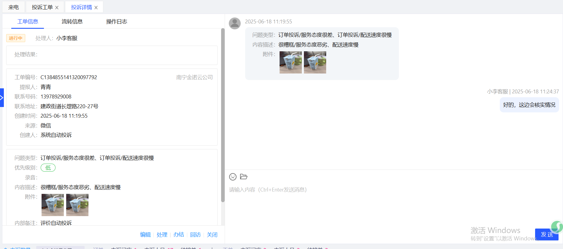 接收单投诉单后,可点击投诉单,进入详情页面,查看客户的投诉内容及附件信息,未办结的工单可显示对话输入框;可发文字和图片,主要类比于留言与评论,有新的消息会触发通知。投诉详情可查看工单的信息、流转信息和操作日志。