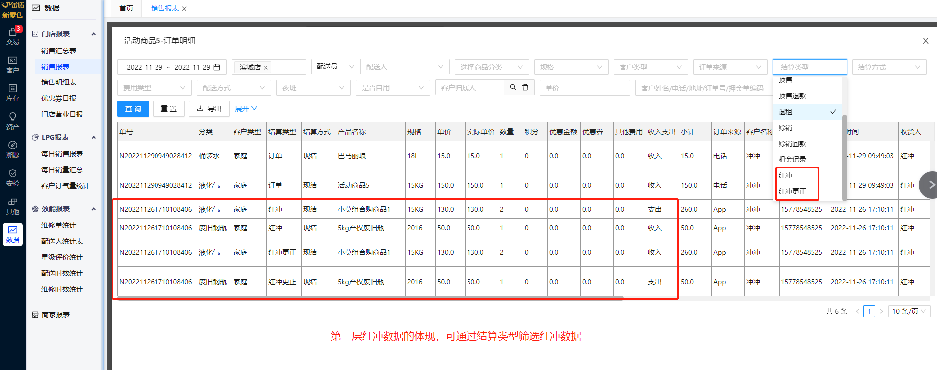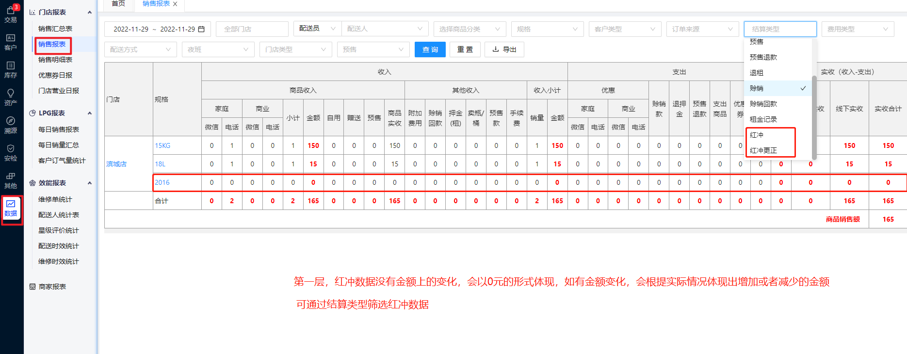 销售报表: 第一层没有红冲标识,第二、第三层有红冲的标识和筛选条件