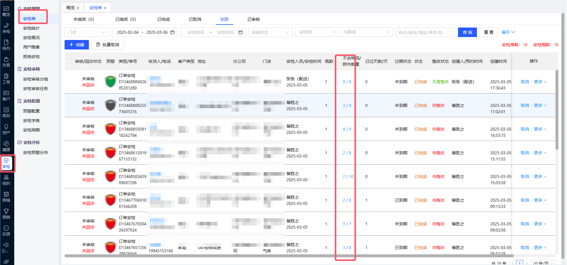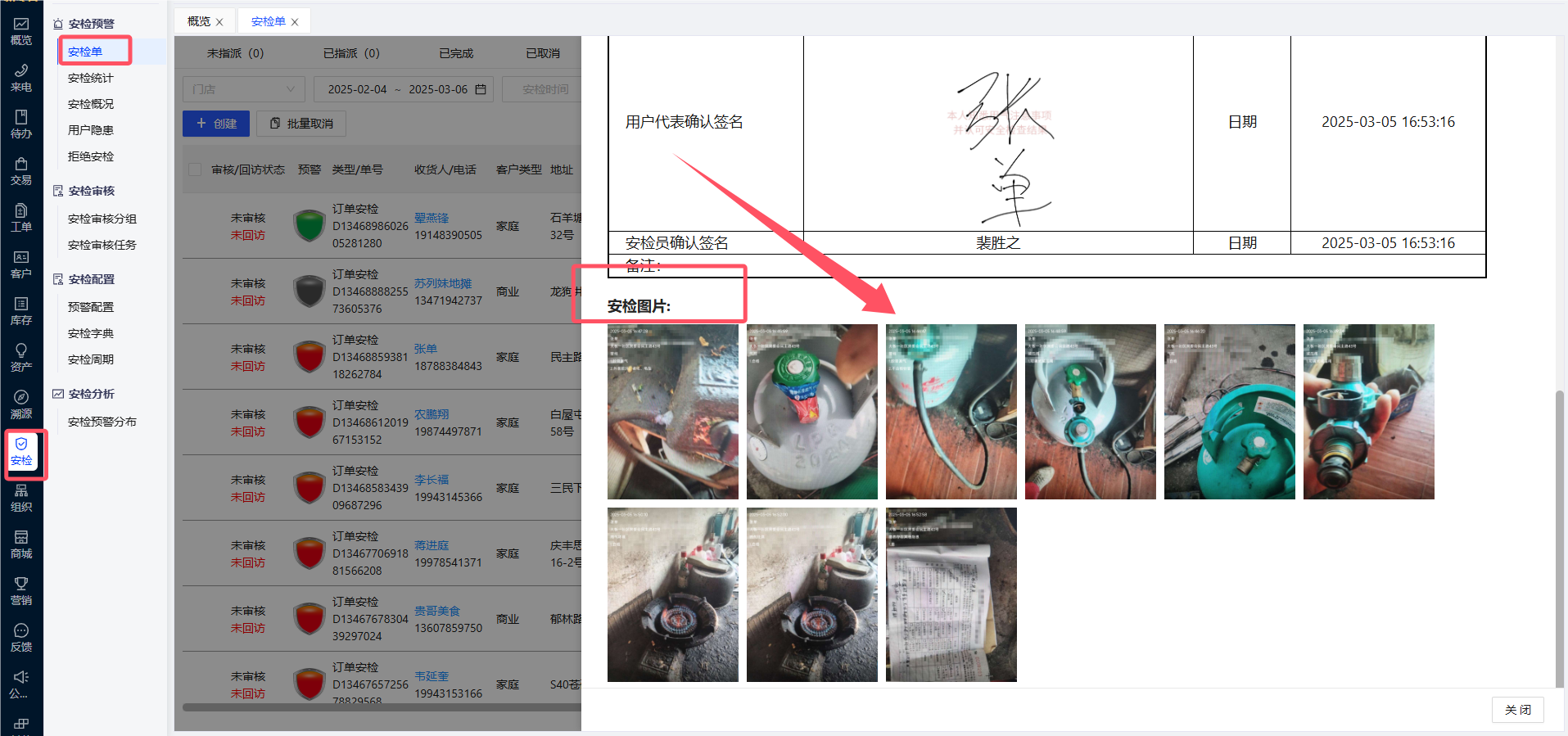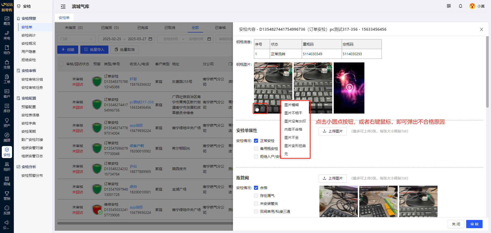 审核师傅给客户做的安检数据是否合格,勾选后的安检标识信息同步到底部对应的类型。