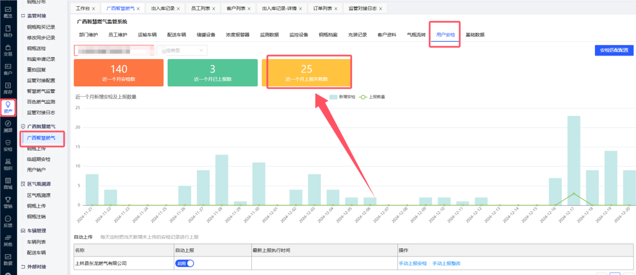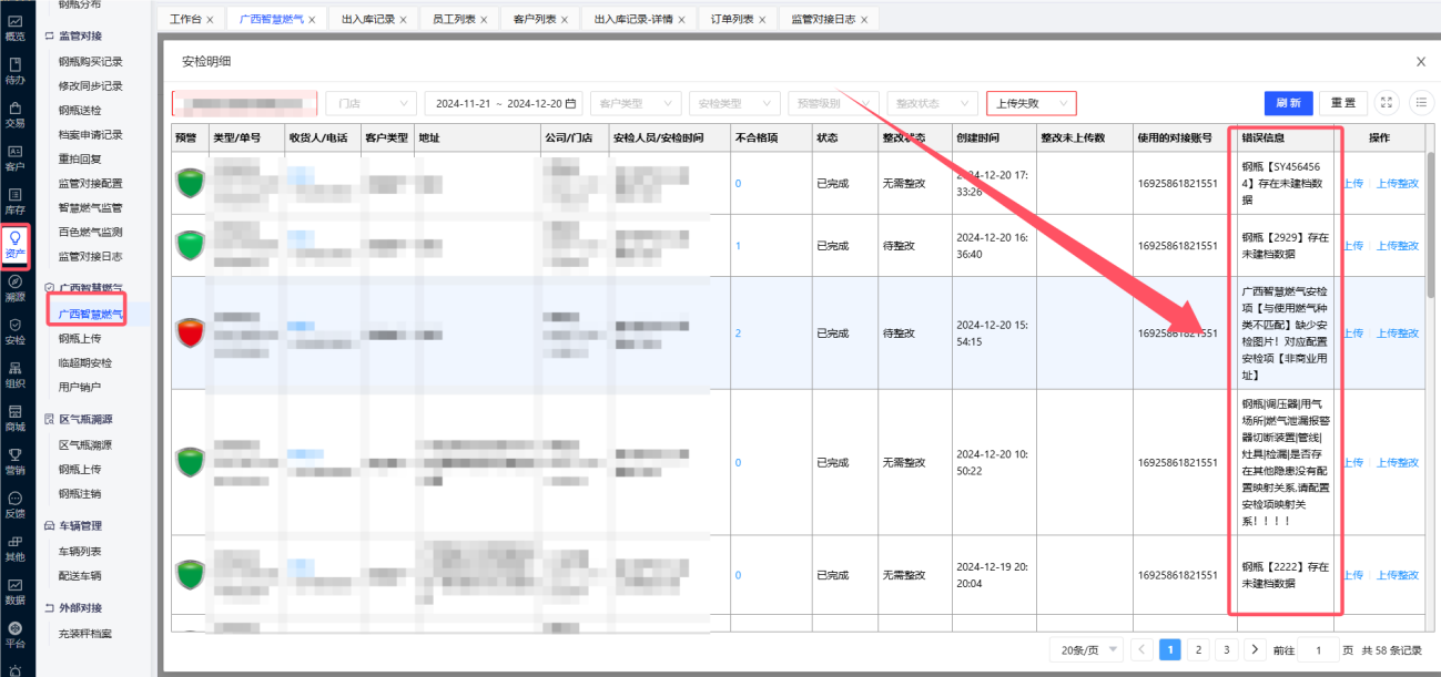 安检上传失败的错误信息可以在【资产】-【广西智慧燃气】-【广西智慧燃气】-【用户安检】的近一个月上报失败数,点击查看上传失败的原因,根据原因修改完成后,点击“上传”即可。