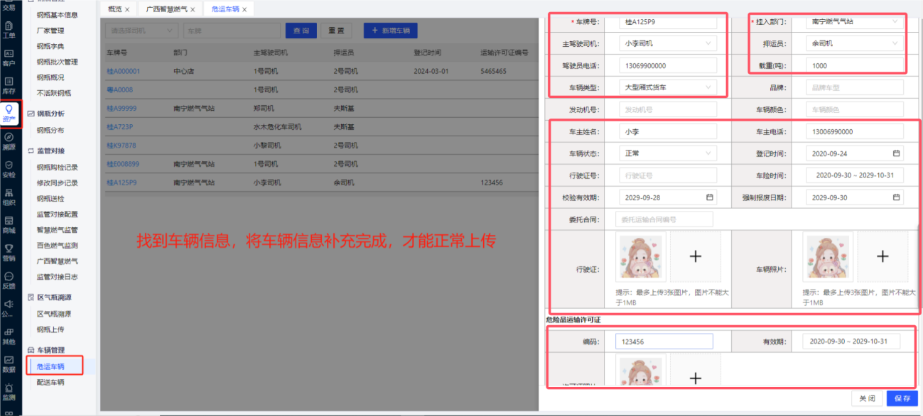 在【资产】- -【车辆管理】- -【危运车辆】中找到要上报的车辆,将车辆信息填写完整。(红色框的都是需要完善的数据)