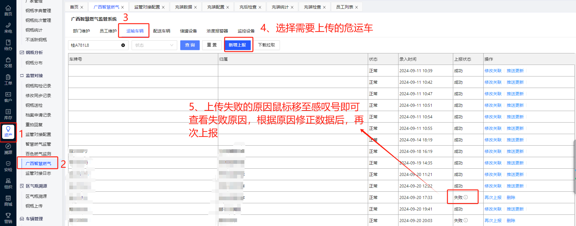 在【资产】- - 【广西智慧燃气】 - -【广西智慧燃气】- -【运输车辆】点击【新增上报】,选择需要上报的危运车,保存提交。