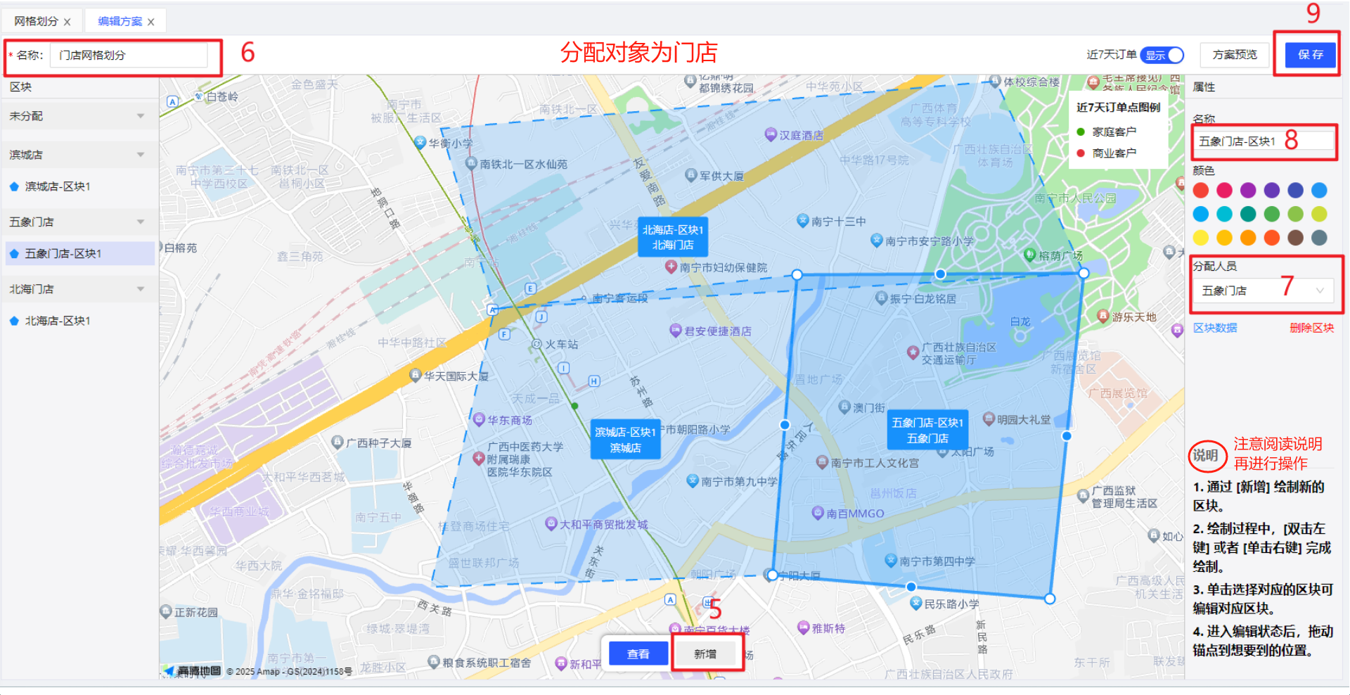 网格派单:根据地图划分网格区域,每个区域绑定固定门店/配送员,客户地址在哪个区域就会派单给那个区域的门店/配送员。