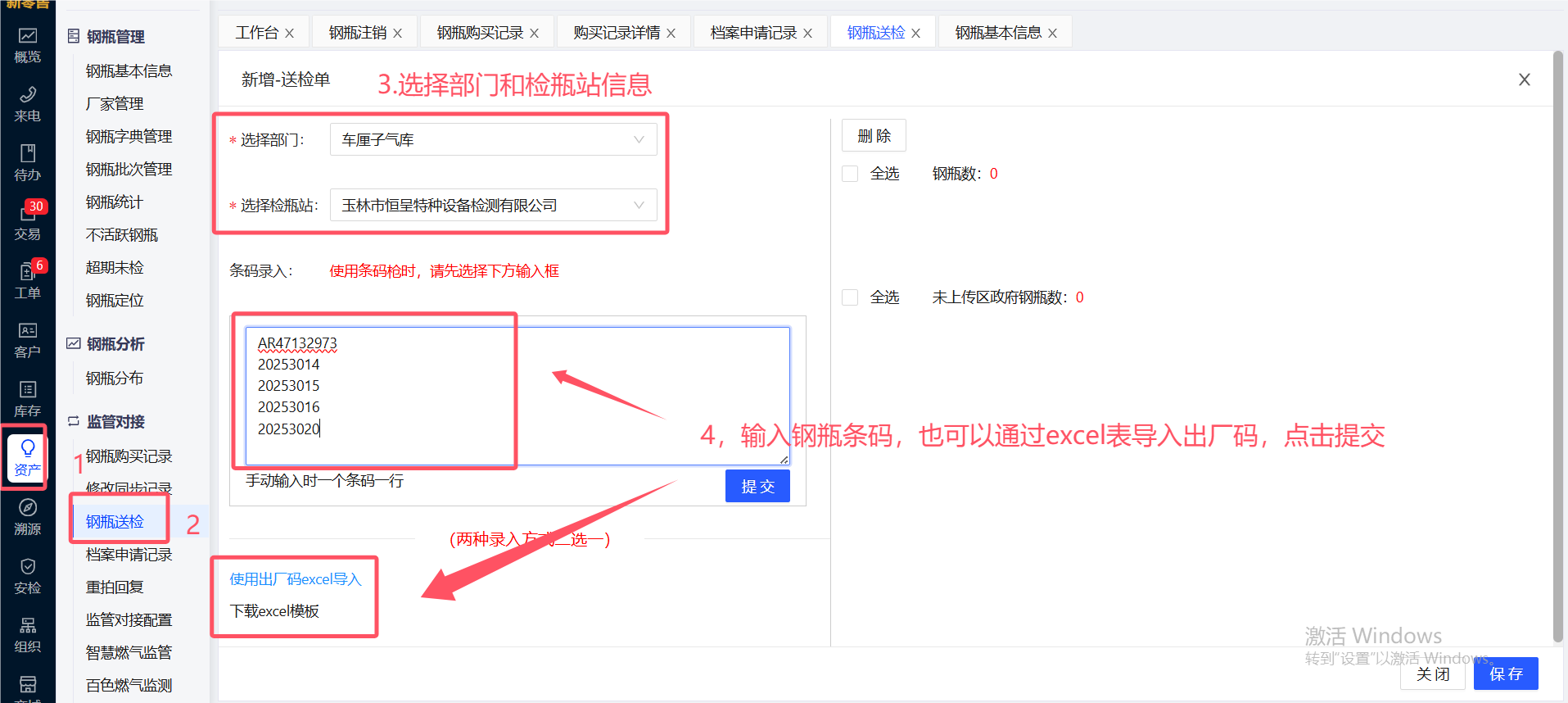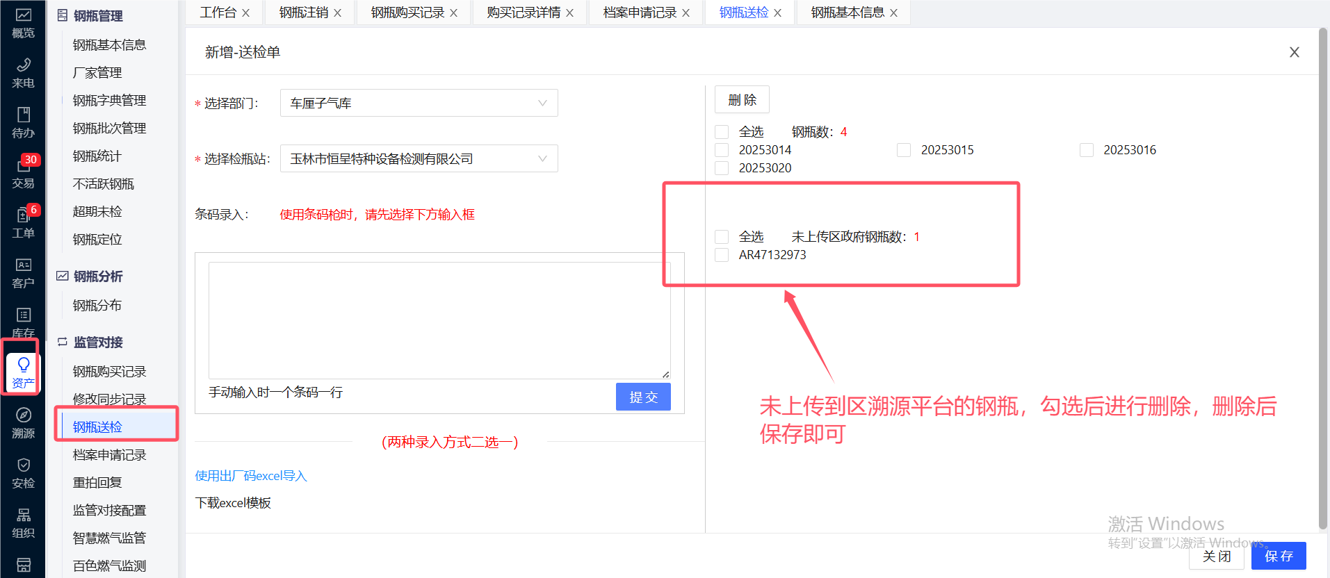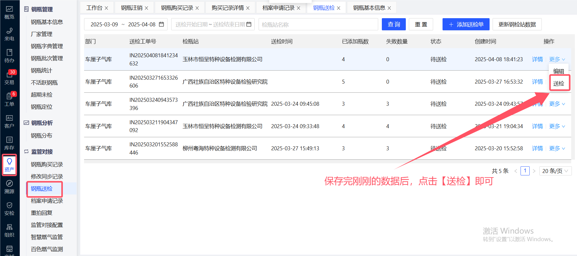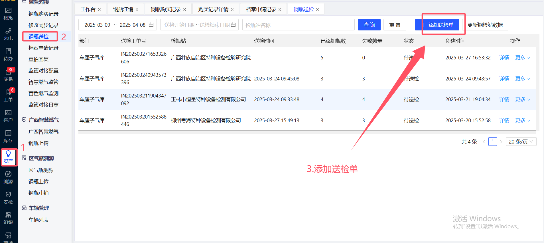 在【资产】-【钢瓶送检】-【添加送检单】添加钢瓶送检信息,增加创建时间的筛选,默认为最近一个月,增加部门的显示,按照管辖范围查询