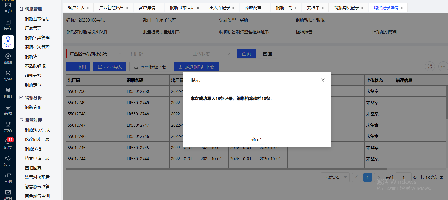 选择对接的平台后,添加钢瓶购买记录信息,点击保存;点击该记录的名称信息,跳转到购买记录详情,导入钢瓶信息